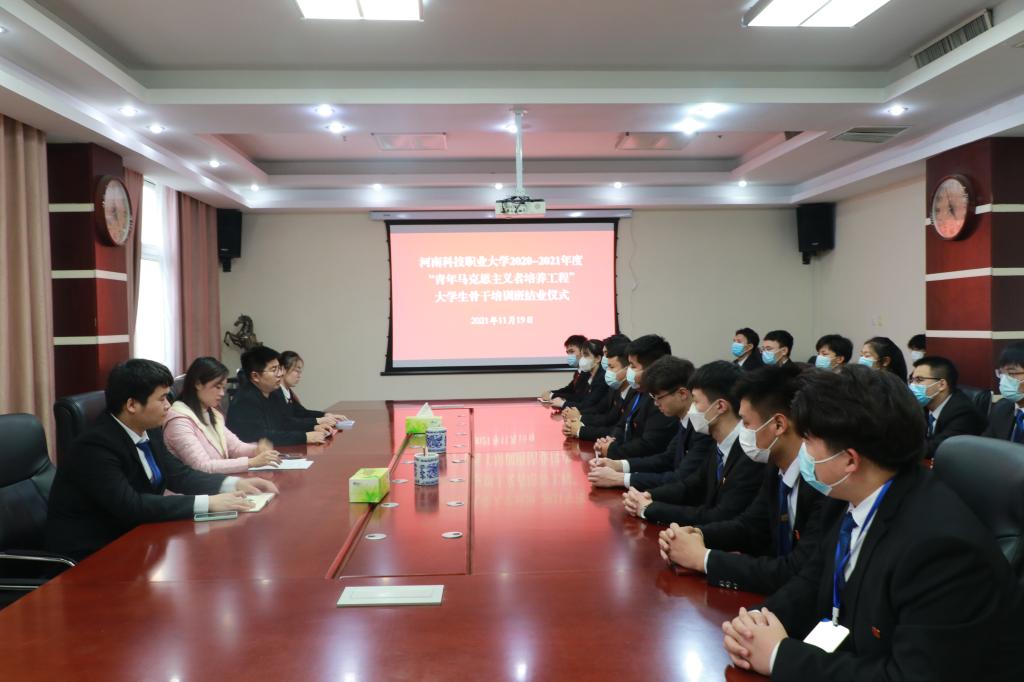11月20日下午,河南科技职业大学2020-2021年度青年马克思主义者培养工程大学生骨干培训班结业仪式于综合楼909会议室举行。校党委宣传部部长 校团委书记刘晓娜、校团委副书记孔建富出席会议,“青马工程”培训班成员参加会议。会议由孔建富主持。