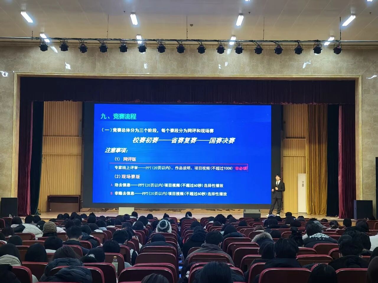 分享会上,宣讲人结合自身备赛经历,系统梳理了“挑战杯”赛事规则,并聚焦选题策略、团队组建及答辩技巧三大核心板块进行了深入讲解。他们重点剖析选题切入点的捕捉技巧,强调紧跟时代脉搏与结合专业特色的重要性;深入探讨申报书的逻辑构建,指导同学们如何通过严谨的行文逻辑提升作品的专业度;针对答辩现场,他们分享如何通过高效的沟通协作展现团队风采,以及如何利用非语言信息增强感染力。这场讲解条理清晰、层层递进,不仅理清了备赛的逻辑脉络,更为同学们提供了宝贵的实战策略。