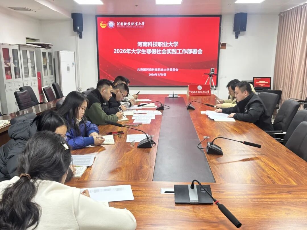 为深入学习宣传贯彻习近平新时代中国特色社会主义思想,全面贯彻落实党的二十届四中全会精神,引导广大青年学生上好与现实相结合的“大思政课”,在社会课堂中“受教育、长才干、作贡献”。2026年1月5日下午,河南科技职业大学2026年大学生寒假社会实践工作部署会在综合楼十二楼会议室召开。校团委书记王亚雷出席会议并讲话,各学院团总支书记参加会议,校团委副书记闫彬彬主持会议。