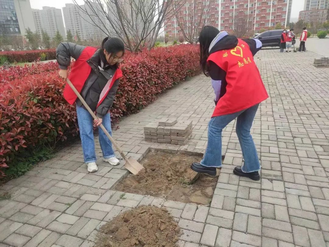 植树现场,身穿鲜红志愿服装的志愿者们热情高涨,其乐融融,大家两人一组,六人一队,或挥锹铲土,或扶苗培土,或踏土压实,志愿者们干劲十足,每个环节做的细致认真,有条不紊。一阵忙碌过后,一株株排列整齐的树苗面向朝阳,昂然挺立,毅然坚守,迸发出盎然的生机,充满了新生的力量,志愿者们用自己的双手美化学校环境、建设绿色家园。参与植树活动的志愿者表示,要努力向下扎深,打牢基础能力;要发奋向上开枝,聚力干事创业,努力为守护绿色校园贡献一份力量,让勃勃生机的树苗伴随莘莘学子一起成长,将绿色理念发扬光大。