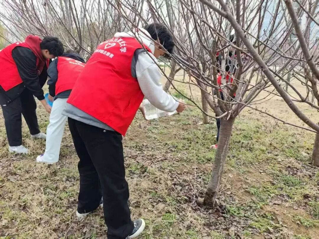 活动现场,志愿者们身着统一服装,手持水桶、水壶等工具,有序前往指定绿化区域。大家分工合作、相互配合,认真清理树木周边的枯枝、落叶与杂草,并为绿植细心浇水灌溉,让每一株草木都能汲取水分、茁壮成长。同学们躬身劳作的身影与春日新绿相映成趣,构成了校园里一道亮丽的青春风景线,让生态文明理念在校园蔚然成风。