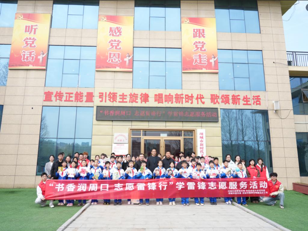 春满周口,书香传情;雷锋精神,薪火相传。为深入学习贯彻习近平总书记对深入开展学雷锋活动作出的重要指示精神,落实与新时代文明实践中心结对共建要求,2026年3月26日上午,河南科技职业大学党委宣传部副部长刘宗阳、校团委书记王亚雷、校团委副书记张哲源、教育科学学院团总支书记李金阳带领青年志愿者,赴项城市新时代文明实践中心、项城市蓝天小学开展”书香润周口,志愿雷锋行”学雷锋志愿服务活动。