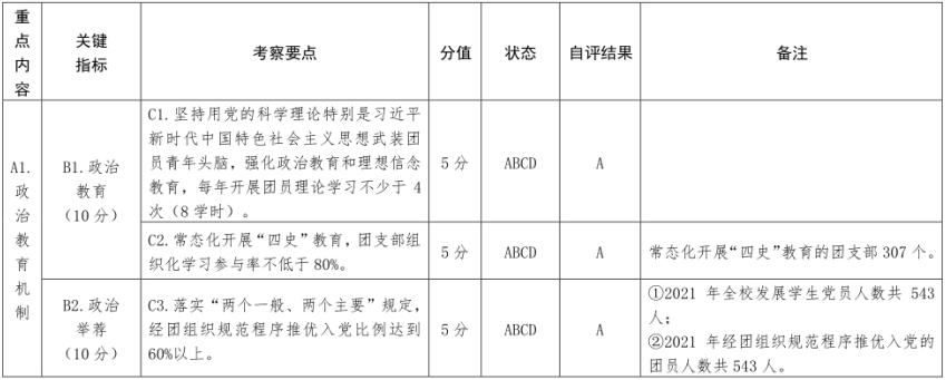 规范开展“三会两制一课”制度,明细二级团总支团费收缴流程;开展团员教育评议;规范团内推优流程;规范“工作到支部”团支部建设提质行动工作;2021年度规范发展团员200名;完成“智慧团建”团员信息录入和管理系统相关内容录入工作,做好团员组织转接工作,我校“学社衔接”率达100%;完成团员先进性评价和各级各类评优工作。