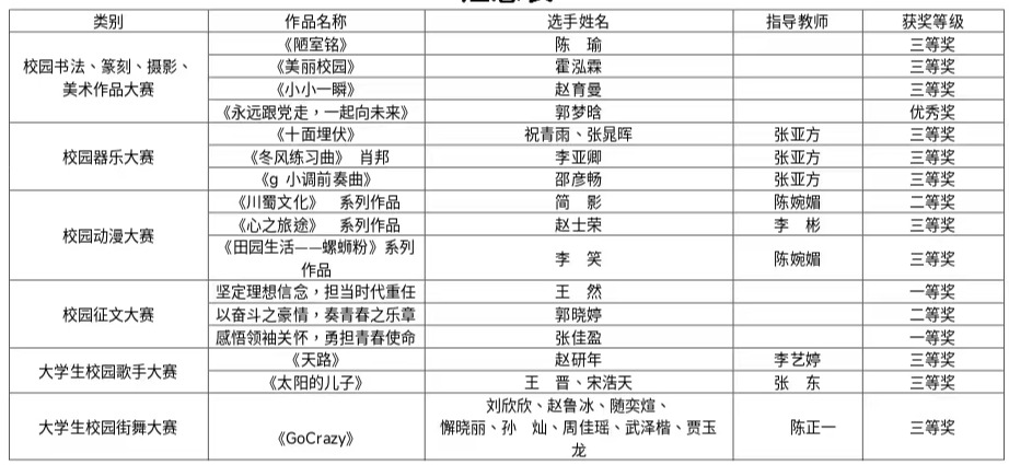 本届大学生科技文化艺术节自启动以来,我校团委高度重视,精心筹划,认真组织校内比赛,为参赛学生配备专业教师悉心指导,做好充分准备,遴选出高质量的作品参加省赛,并取得了优异成绩。