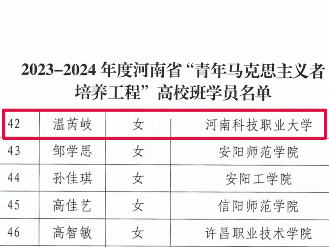 近期,共青团河南省委公布了2023-2024年度河南省“青马工程”高校班录取名单,我校“青年马克思主义者培养工程暨学生骨干培养计划”培训班学员温芮岐同学经过资格审查、学校推荐、综合评审等选拔程序,最终脱颖而出,成功入选2023–2024年度河南省“青年马克思主义者培养工程”培养班高校班。