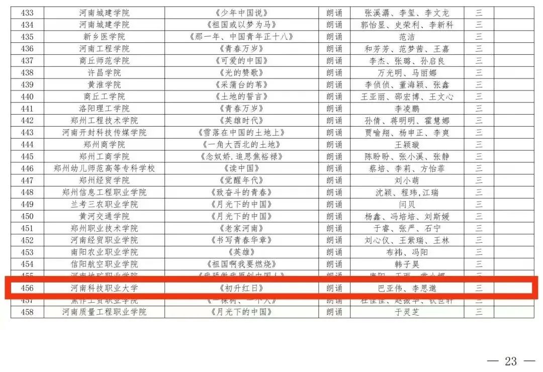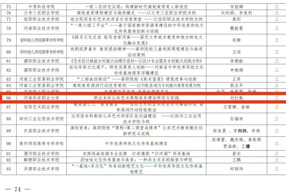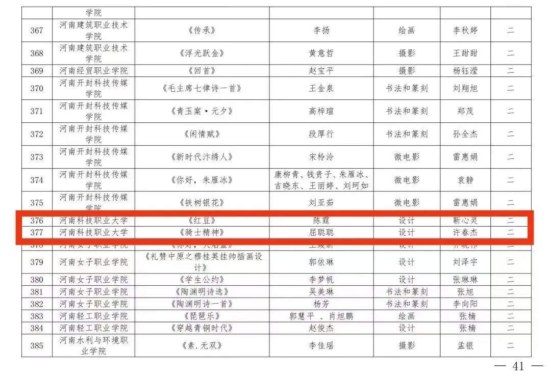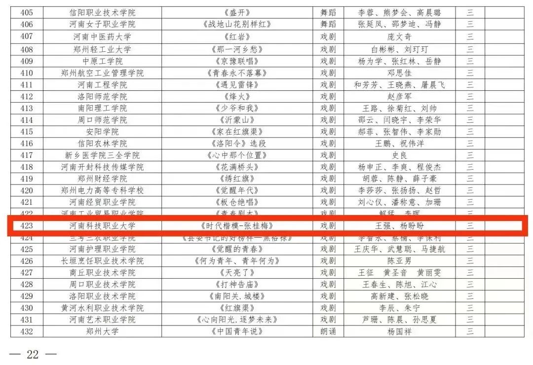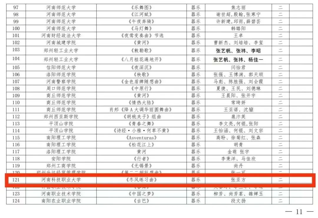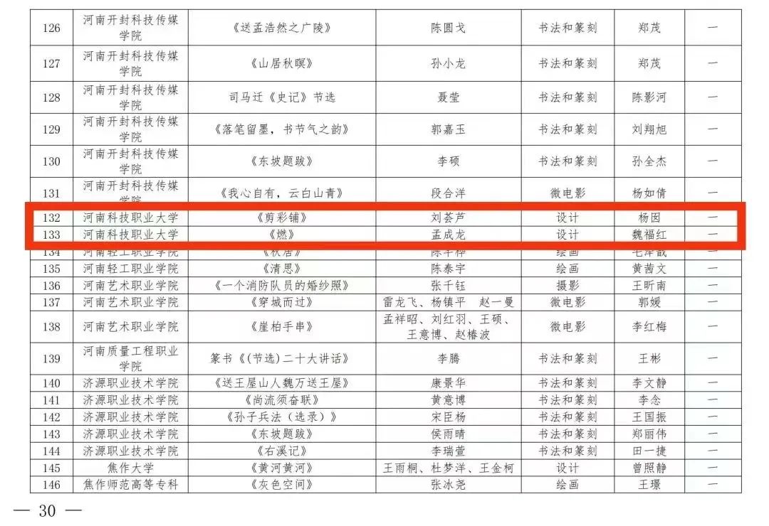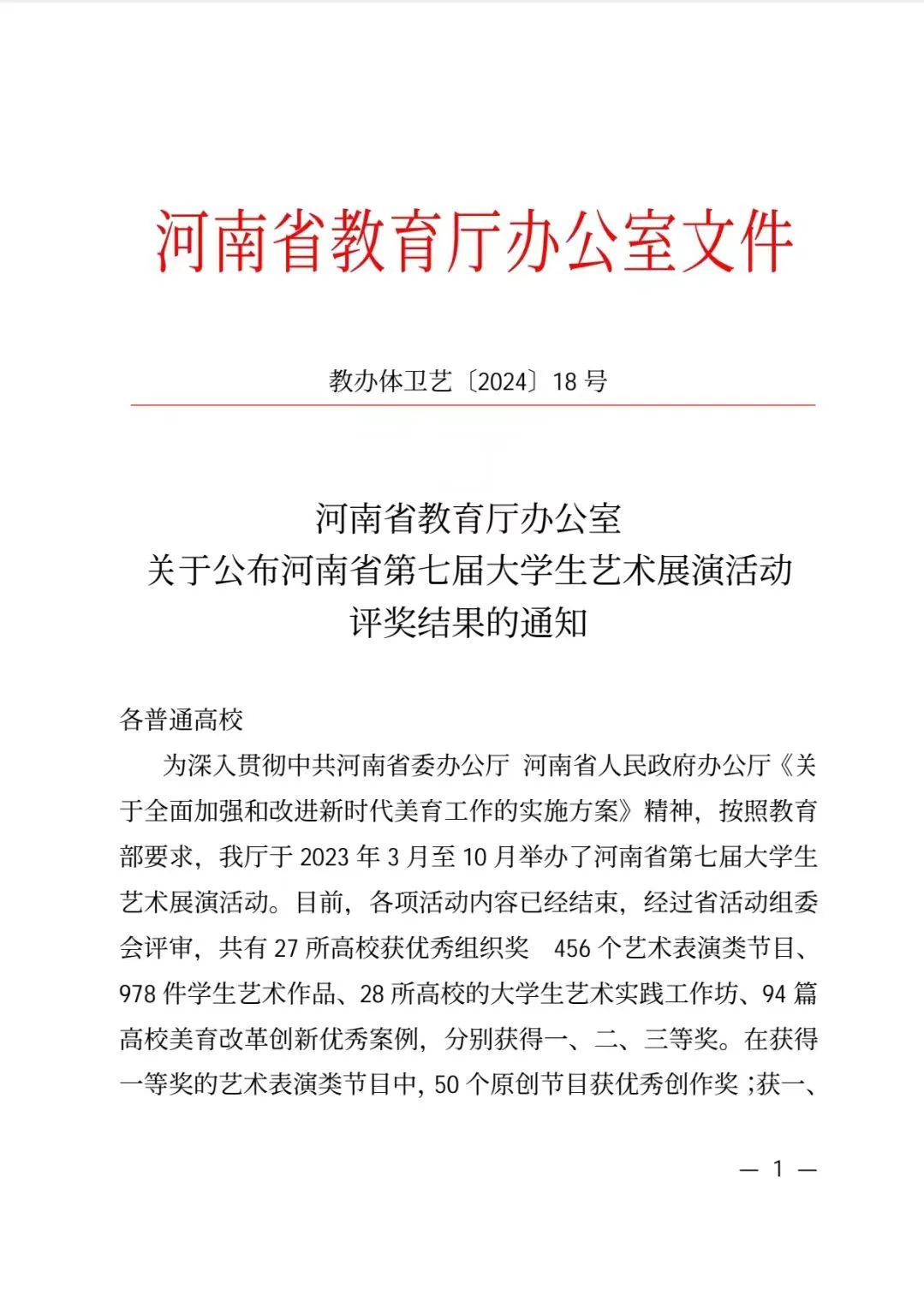 近日,河南省教育厅下发了《河南省教育厅办公室关于公布河南省第七届大学生艺术展演活动评奖结果的通知》(教体卫艺[2024]18号),我校在本届赛事中获得优异成绩,共荣获艺术表演类获二等奖1项、三等奖4项;艺术作品获一等奖2项、二等奖2项、三等奖10项;高校美育改革创新优秀案例获三等奖1项,在获奖数量和层次上均实现了新突破。