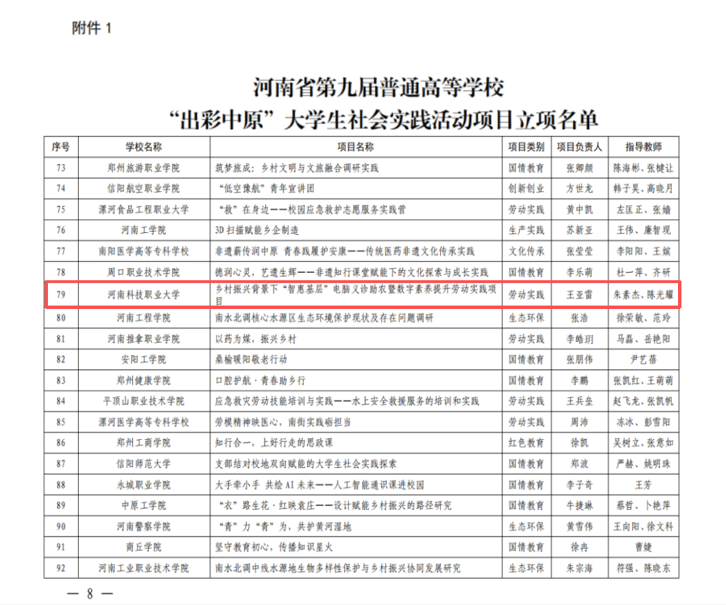 近日,河南省教育厅公布了第九届普通高等学校"出彩中原”大学生社会实践活动立项结果。经各高校推荐申报、省教育厅组织专家评审,全省共评出140个立项项目,我校申报的《乡村振兴背景下“智惠基层”电脑义诊助农暨数字素养提升劳动实践项目》,成功获批第九届河南省普通高校“出彩中原”大学生社会实践活动项目。