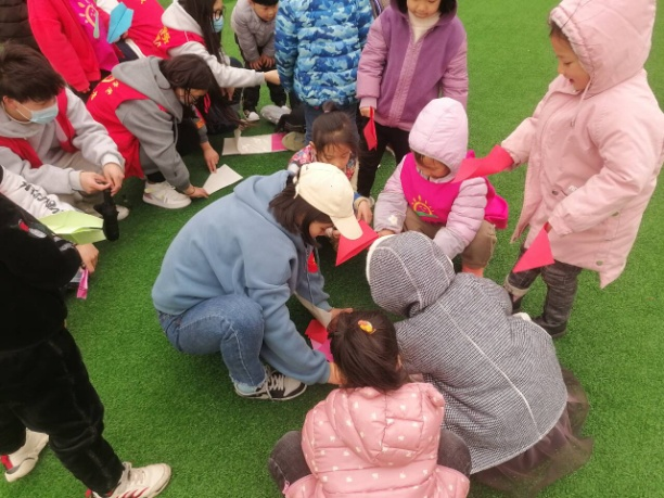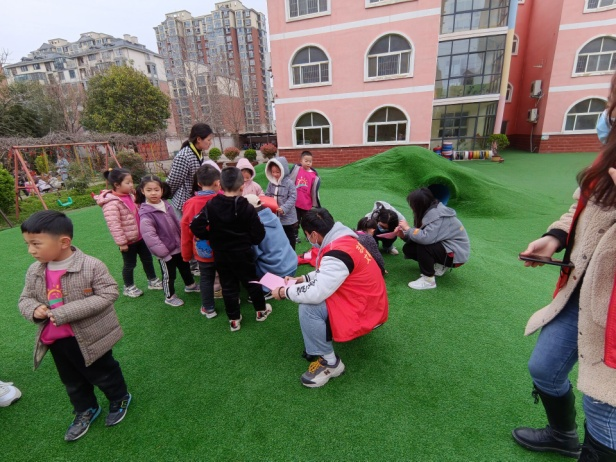 此次活动范围在周口市川汇区阳光雨露博宇幼儿园,活动主要内容:跟小朋友玩游戏,比如丢手绢,老鹰捉小鸡等游戏,一起画画,教孩子们折彩纸,还给小朋友们讲述雷锋的故事。让他们感受到我们的热情,感受到我们的志愿者的爱。我们几人分工明确做着我们的工作,有带领他们一起做游戏的,有教他们折卡纸的,有给他们讲小故事,还有给他们讲述红色精神的。让他们知道红色精神的意义并让他们明白红色精神是什么,从小就接受红色精神的熏陶。