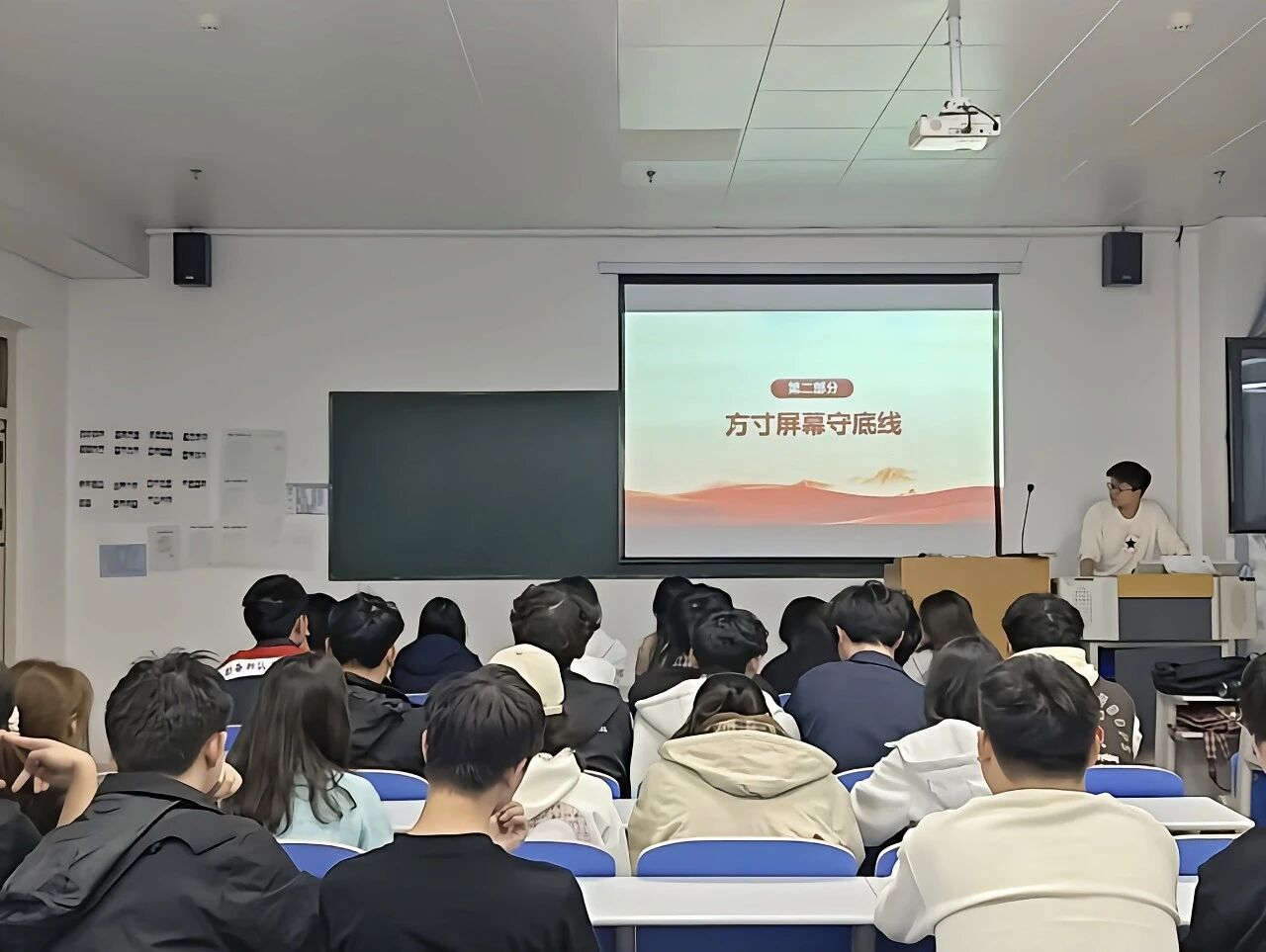 活动初始,主讲人详细的介绍了网络谣言的生成传播路径、不实信息的潜在危害,同时明确网络言论的法律边界与道德准则。从网络暴力的负面影响,到恶意造谣的法律后果,再到校园网络行为规范,全方位为学生梳理舆情应对要点,让同学清晰认识到“网络绝非法外之地”。