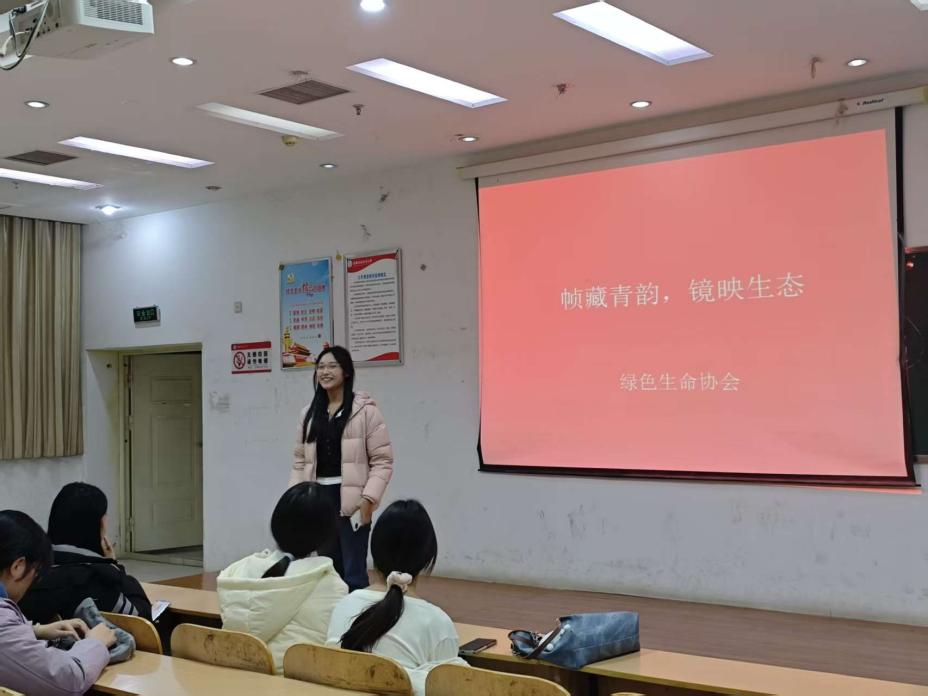 为深化绿色生态理念传播,提升大众生态保护意识,丰富社团活动形式,锤炼社员实践能力。绿色生命协会社团于2025年12月10日在综合楼东南二阶梯教室进行“帧藏青韵,镜映生态”主题活动。